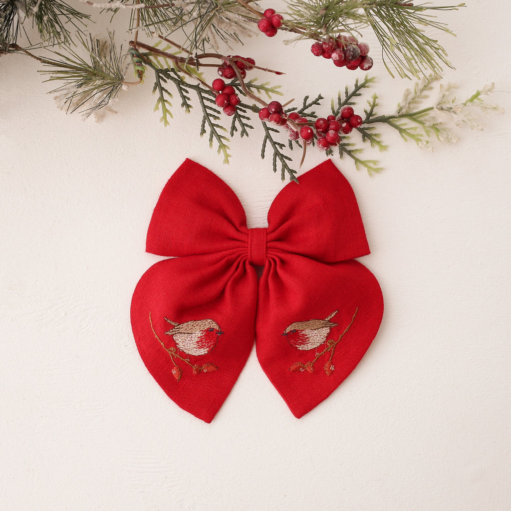 Embroidered Hair Bow with "Christmas Robin" Embroidery in Scarlet Red Linen