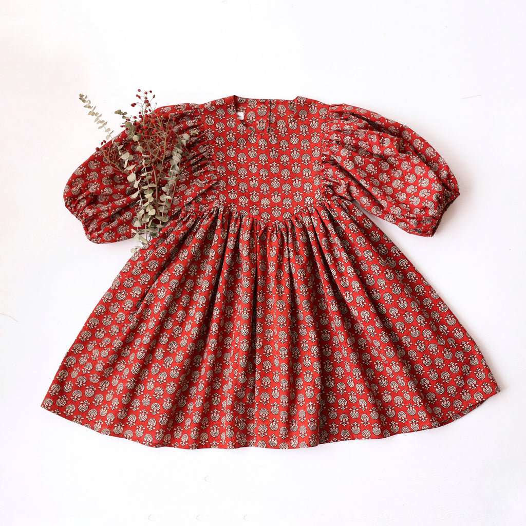 Festive Florals Cotton Puff Sleeve V-Bodice Dress