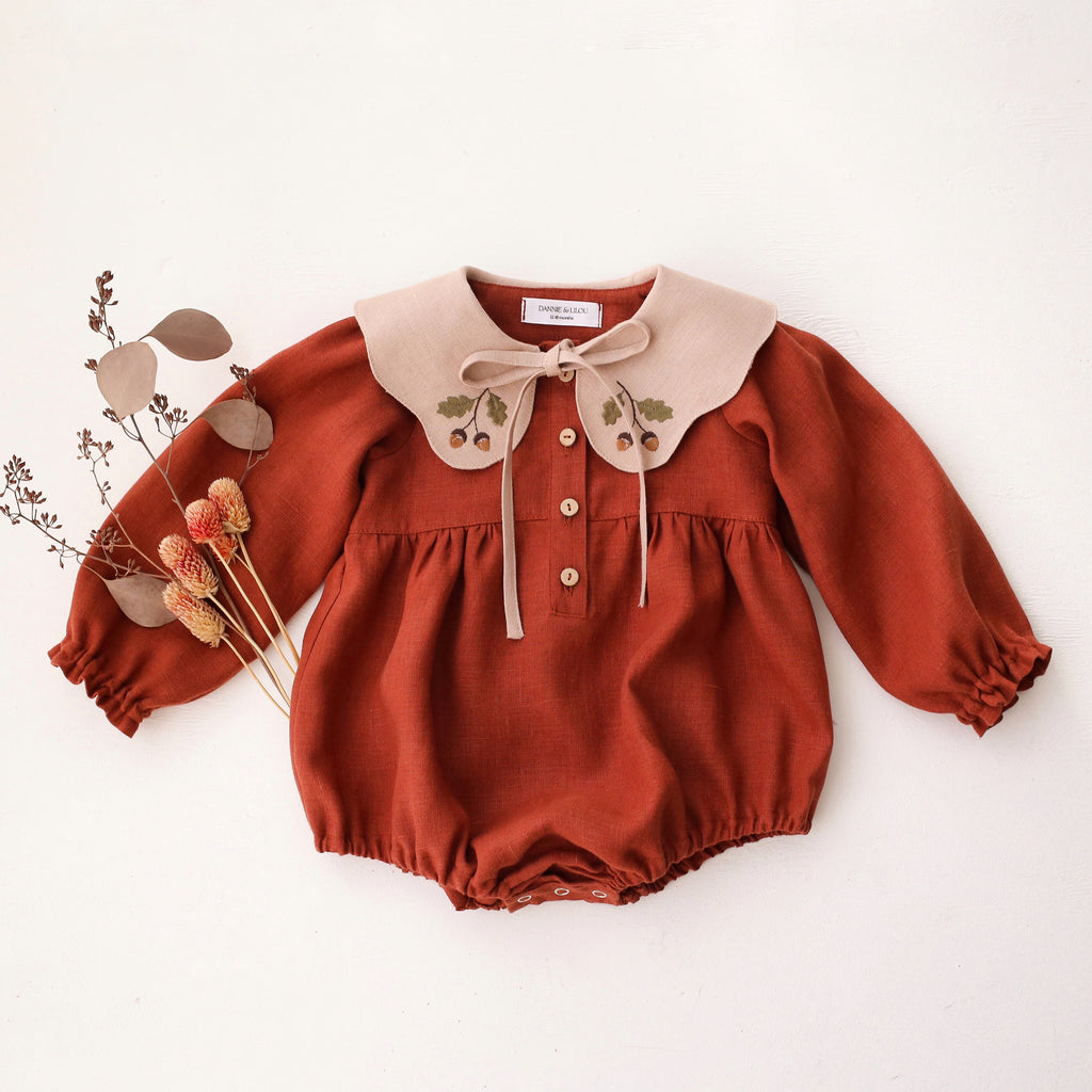 Rust Linen Long Sleeve Bubble Playsuit with Petal Collar in Beige Linen with “Mini Acorns” Embroidery