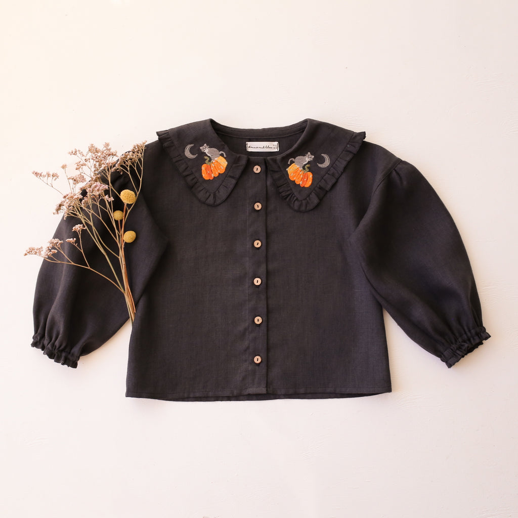 Black Linen Frilled Collar Bubble Sleeve Blouse with "Cat & Pumpkin" Embroidery