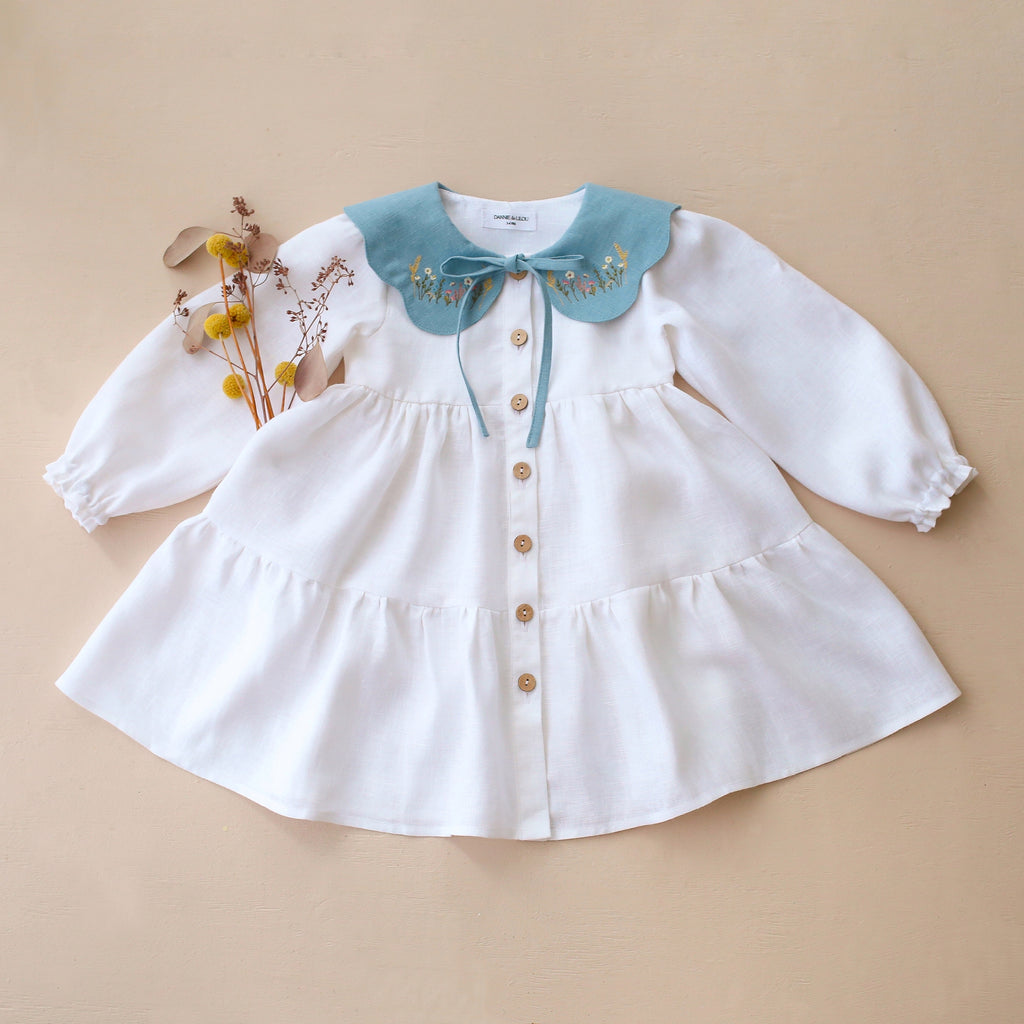 White Linen Long Sleeve Tiered Dress with Petal Collar in Chalky Blue Linen with "Wheat Flower Field" Embroidery
