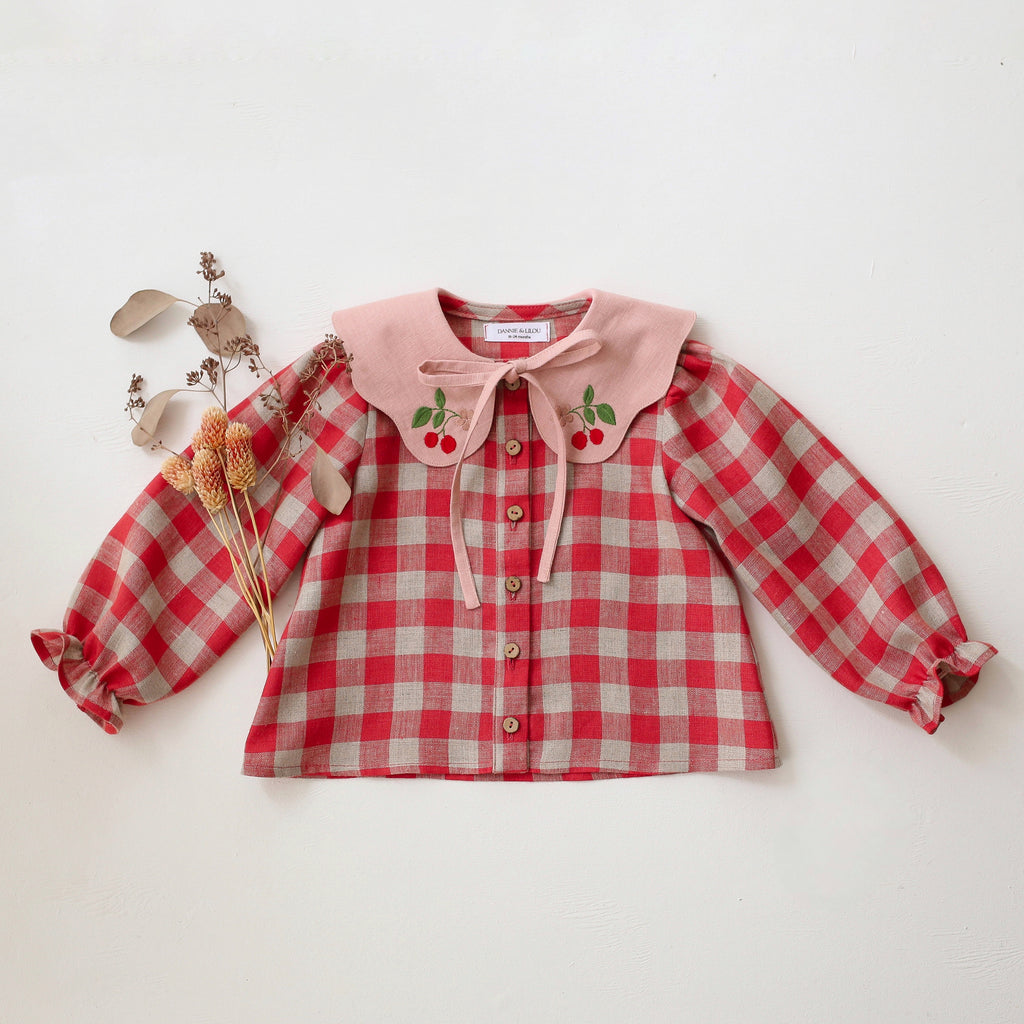 Cherry Check Linen Long Sleeve Button Front Blouse with Petal Collar in Powder Linen with “Cherry” Embroidery