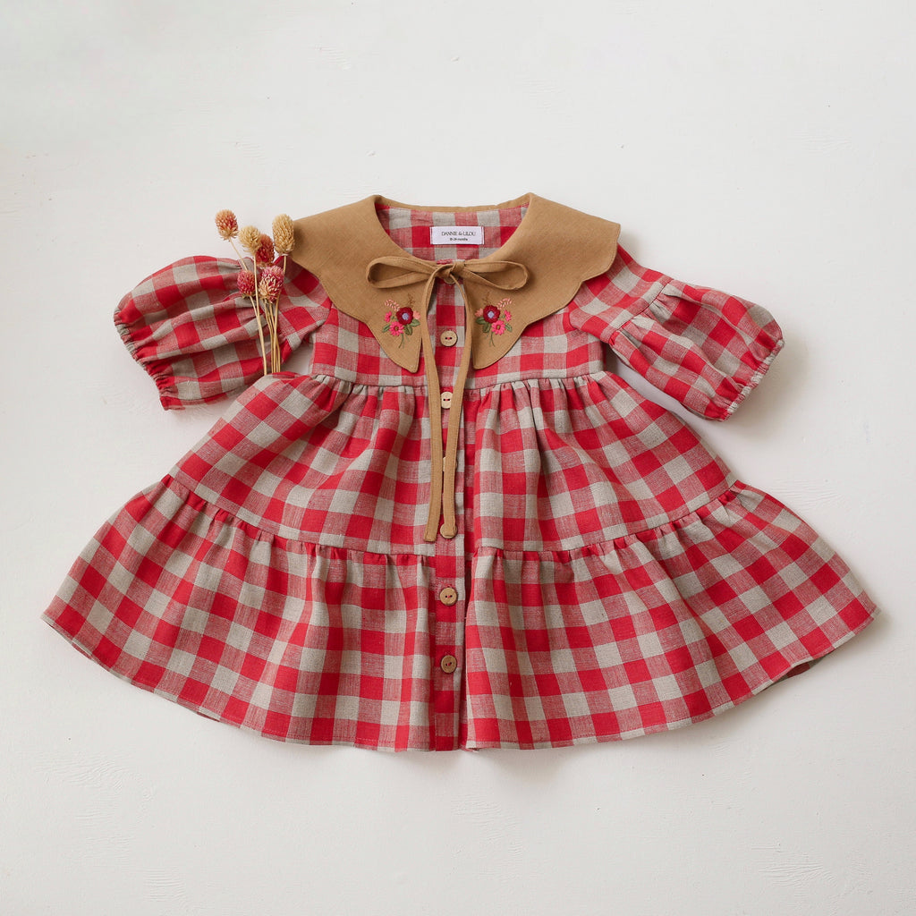 Cherry Check Linen Lantern Sleeve Tiered Dress with Scalloped Collar in Latte Linen with "Meadow Posy" Embroidery