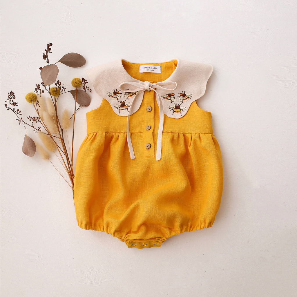 Marigold Linen Bubble Playsuit with Petal Collar in Ivory Linen with "3 Bumblebees" Embroidery